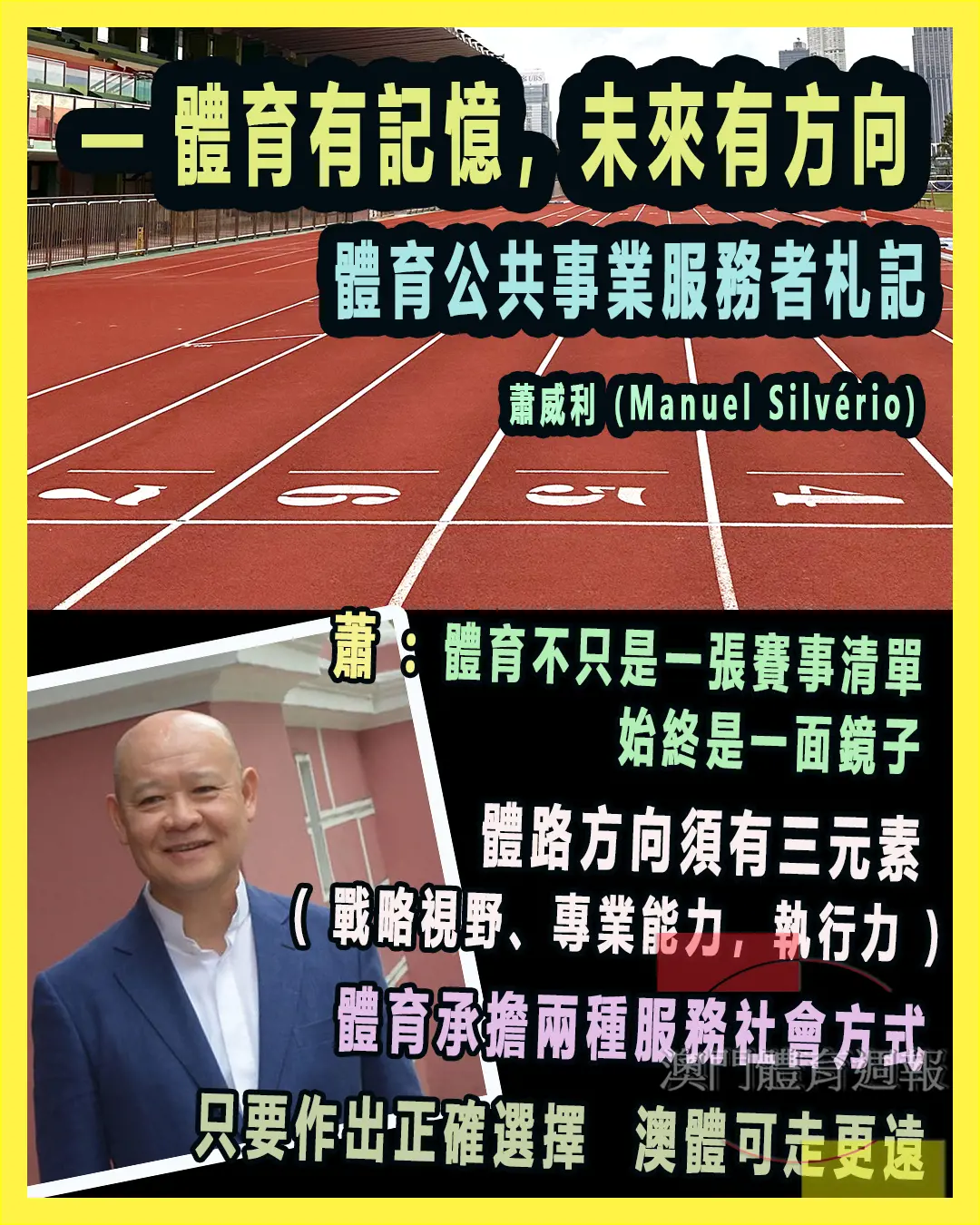 我僅以曾在澳門體制內外服務於體育事業之身份,不帶任何私利,分享這些札記。我懷着感恩之心,也懷着願望:希望澳門的體育之路能夠走得更遠。開始撰寫這些文字,其目的其實很簡單:以冷靜、克制和負責任的態