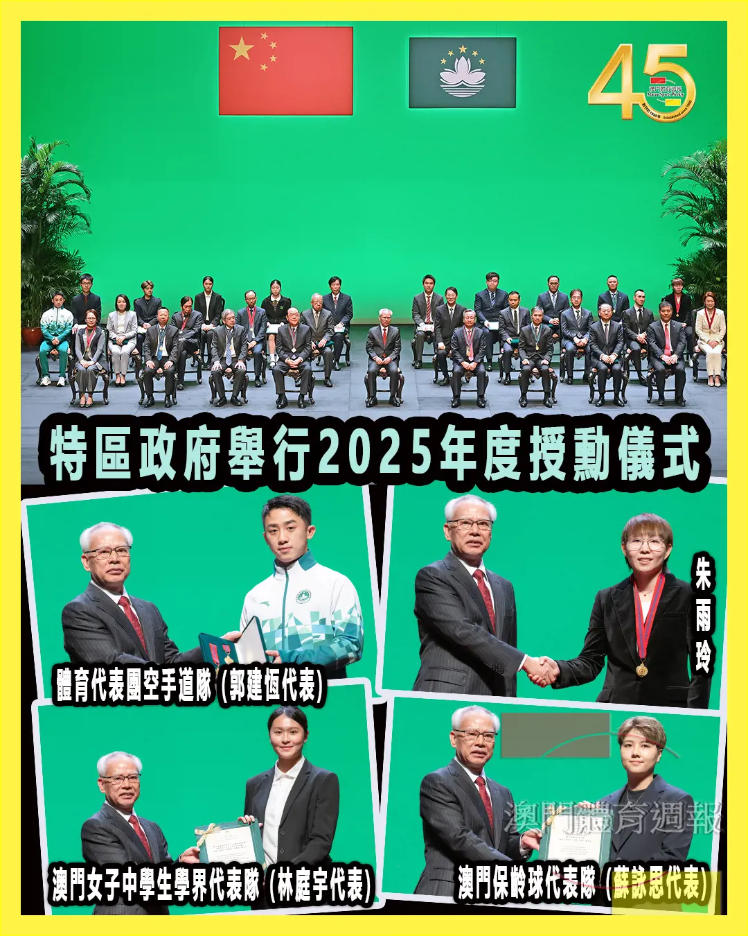 特區政府今 (30日)下午四時在澳門文化中心綜合劇院舉行“2025年度勳章、獎章和獎狀頒授儀式”,以表揚在個人成就、社會貢獻或服務澳門特區方面有傑出表現的人士或實體。澳門特區體育代表團空手道隊(郭建恆