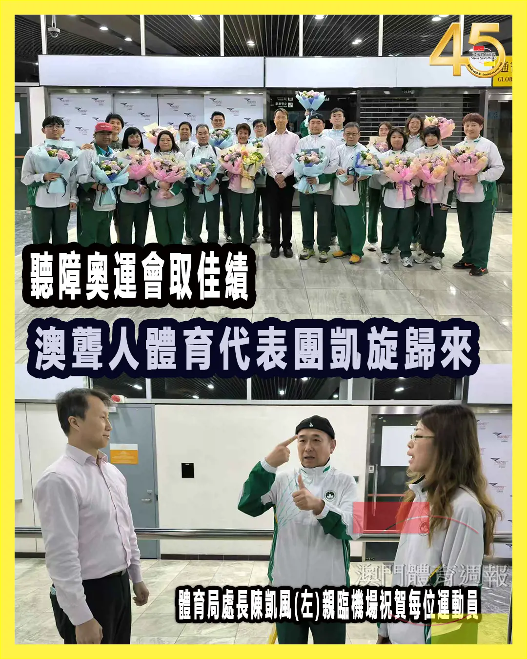 澳門聾人代表團於日前圓滿完成第二十五屆聽障奧運會的所有賽事,載譽歸來。代表團在今次賽事中表現卓越,體育社團輔助處處長陳凱風及本會理事代表曾寶明,昨日親臨機場迎接代表團凱旋,並對運動員們的出色表現致以熱