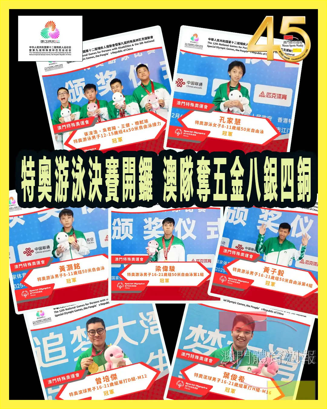 特奧游泳決賽開鑼 澳隊奪五金八銀四銅特奧游泳項目經過多日預賽,決賽賽事正式展開,並將於這三天內決出所有特奧游泳項目獎項,澳門隊於十二日奪五金、八銀、四銅。殘奧游泳方面,男子100米仰泳S14項目,蔡子