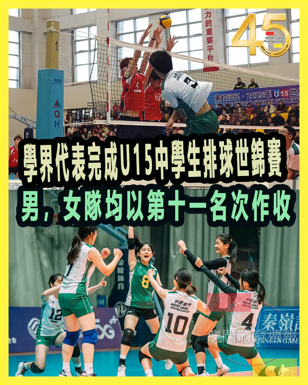 2025年U15世界中學生排球錦標賽,澳門學界U15男、女子排球代表隊周五(12日)分別不敵國家二隊和印度二隊,結束本之中學生世錦賽之旅。U15男排奮力攔阻國家二隊進攻.麥子俊衝擊國家二隊攔網防線學界