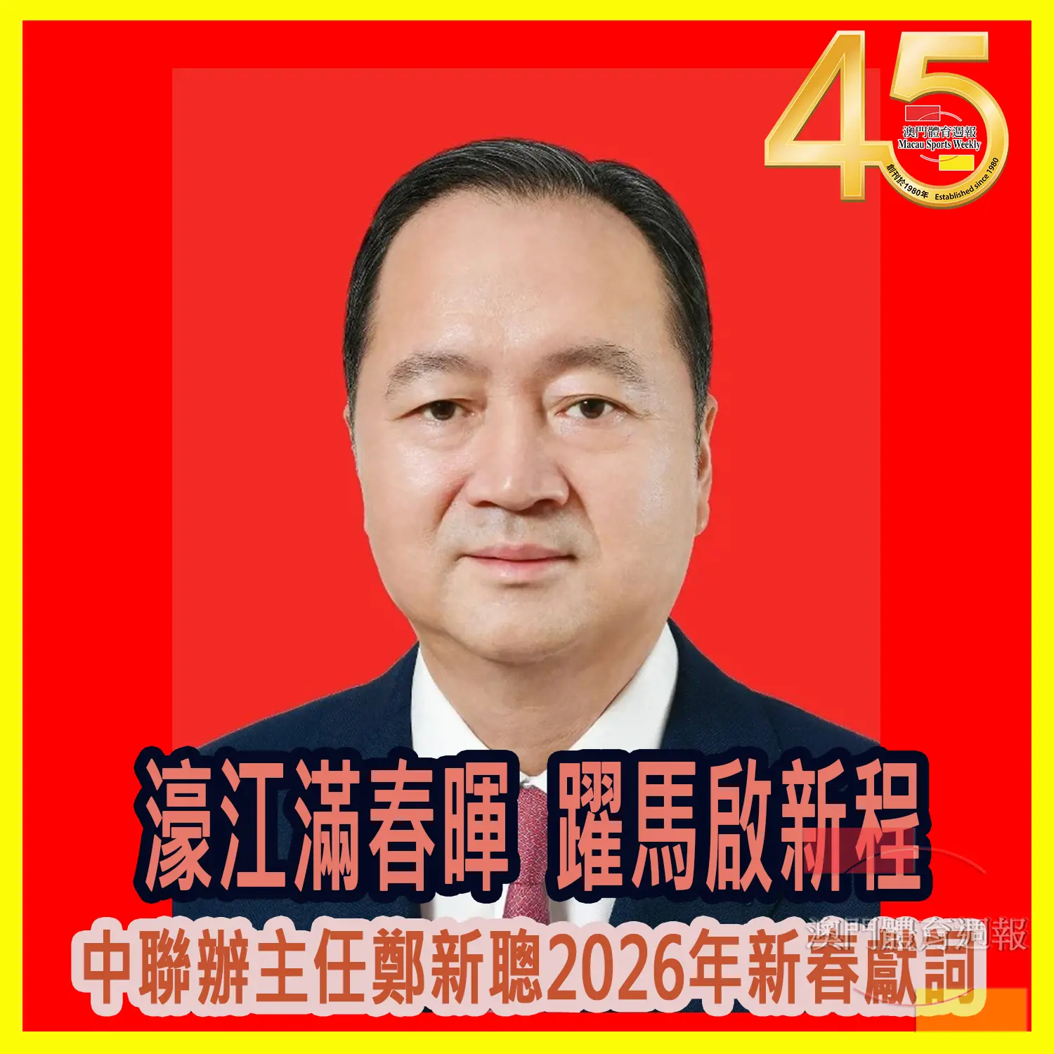 中央政府駐澳門聯絡辦公室主任鄭新聰16日發表2026年新春獻詞。全文如下:靈蛇獻瑞辭舊歲,駿馬奔騰踏春來。值此馬年新春之際,受中央港澳辦主任、國務院港澳辦主任夏寶龍委託,我代表夏寶龍主任、中央港澳辦、