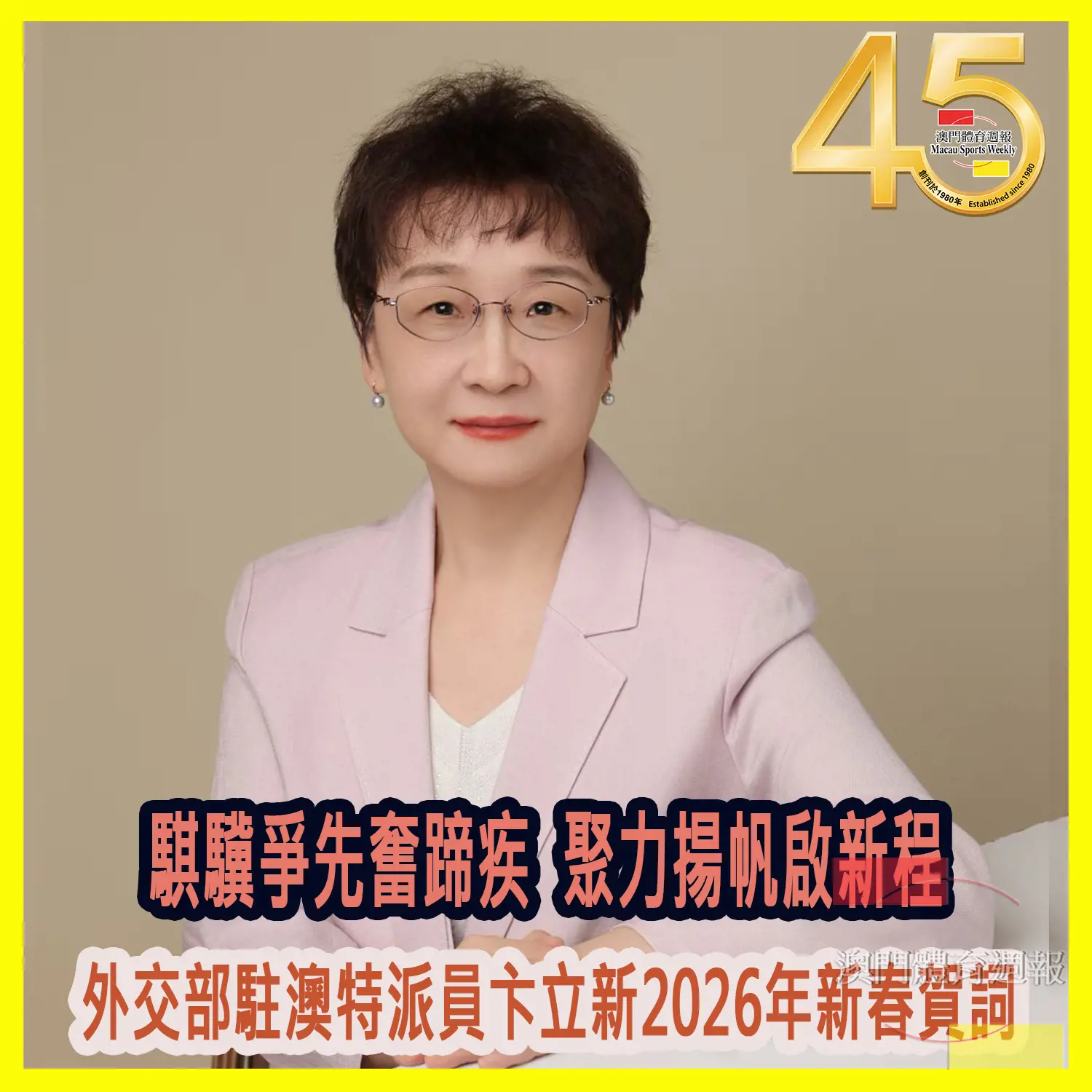 外交部駐澳門特派員卞立新6日發表2026年新春賀詞。全文如下:春風送暖花千樹,駿馬揚蹄福萬家。值此丙午馬年新春佳節,我謹代表外交部駐澳門公署向廣大澳門同胞拜年,恭祝大家新春快樂,馬到成功!“小城故