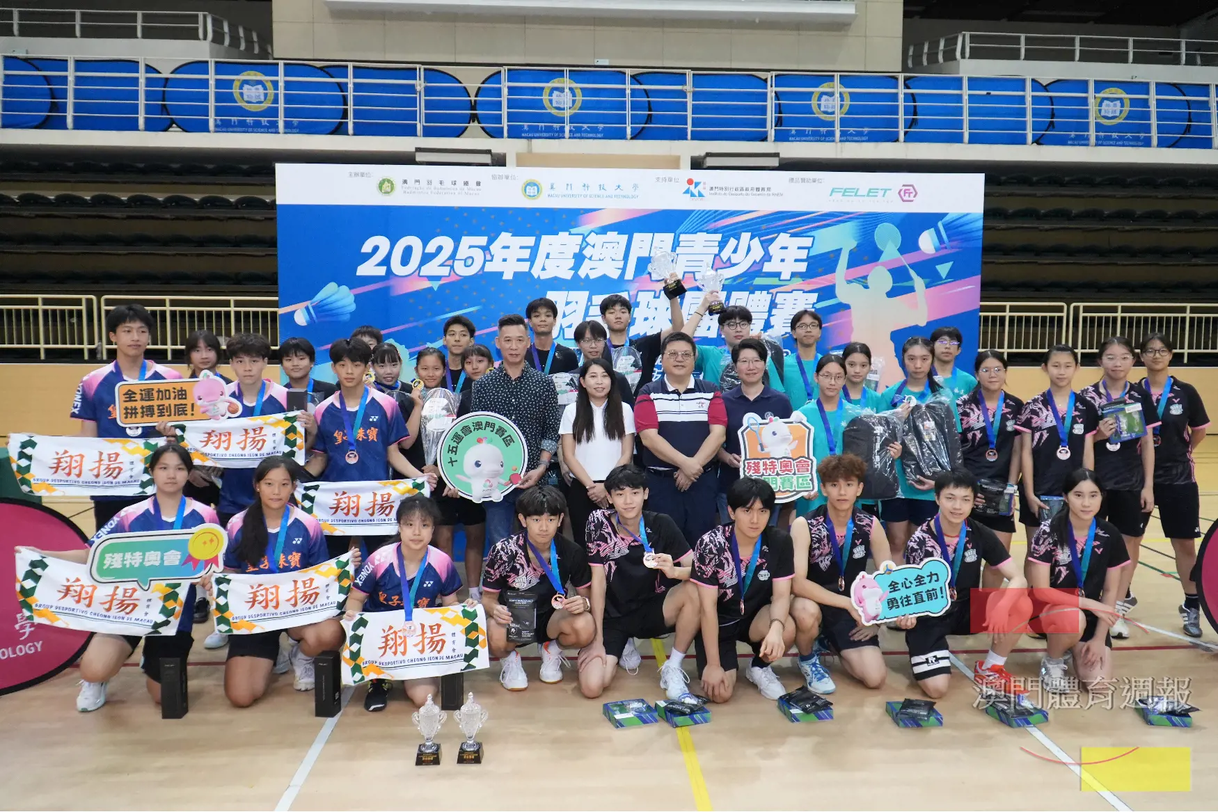 「2025年度全澳青少年羽毛球團體賽」於昨日(29日)假澳門科技大學室內體育館結煞科,本地突破羽毛球隊以總分2:0完勝香港福建中學B隊奪冠,翔揚隊獲季軍。全場大合照 賽事由澳門羽毛球總會主辦、澳